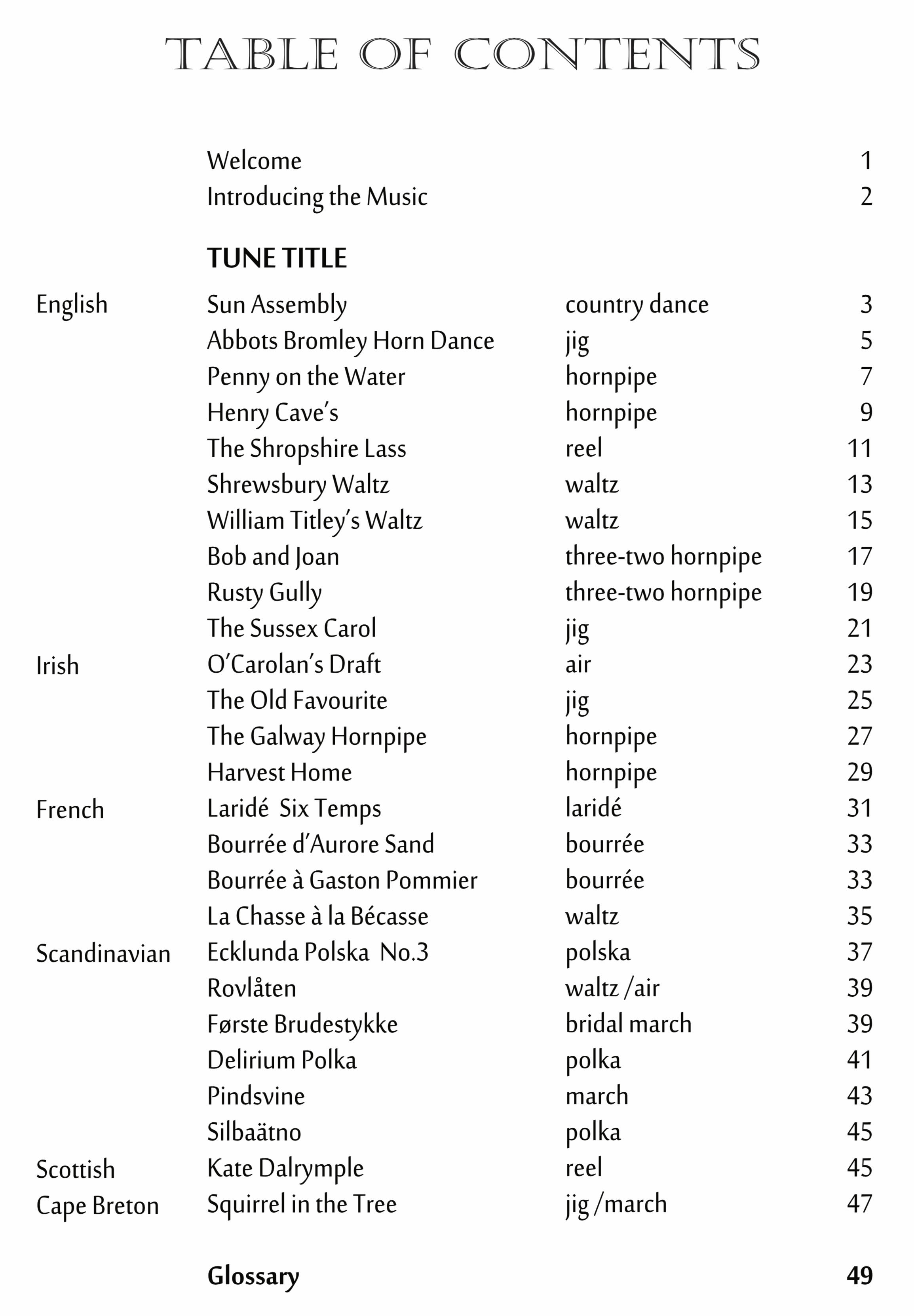A treasure chest of traditional tunes from the British Isles & beyond, perfectly partnered with original harmony parts.Twenty-six jigs, reels, polkas, waltzes, bourrées, polskas, airs & hornpipes.Suitable for a wide range of melody instruments.Friendly, clear side-by-side layout.Bowing included for the benefit of string players.Audio downloads for ALL tunes included, played on violin: tune solo; harmony solo, tune & harmony combined.Guitar chords included (downloadable pdf book).ISBN: 978-1-7391369-0-1